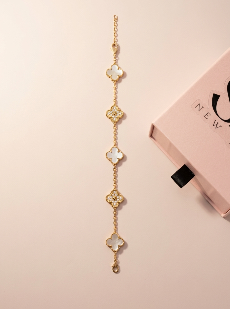 Elevate your everyday style with this 18K Gold-Plated Clover Bracelet, designed for effortless elegance. Featuring delicate clover-shaped accents with a mix of polished gold and luminous inlays, this piece symbolizes luck and timeless beauty.